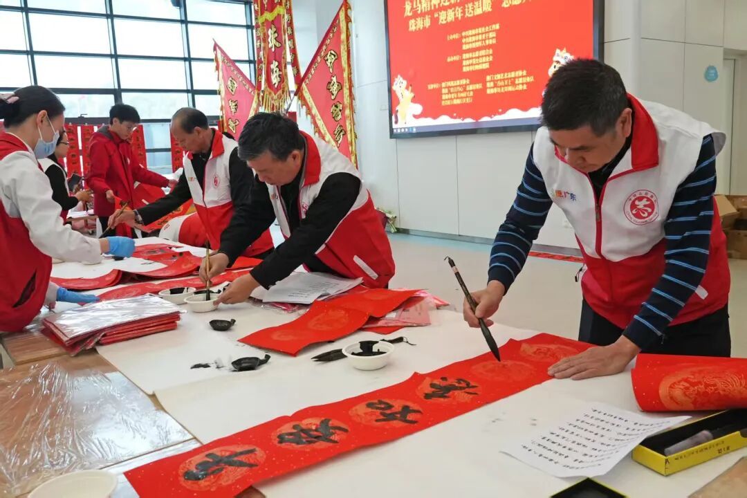 活动现场,书法家们挥毫泼墨,一副副寓意吉祥的春联、一张张饱含祝福的“福”字跃然纸上。而在旁边的展台,建行志愿者正拿着金融宣传折页,向等候的患者和忙碌的医护人员讲解防诈骗知识。